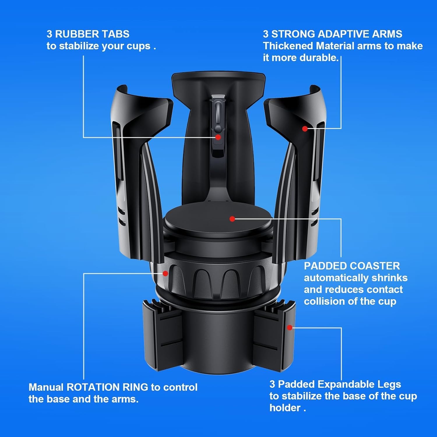 Automatic Cup Holder Expander: Our car water bottle holder features an upgraded auto-lock design, allowing the three adjustable arms to automatically expand according to the cup size. No more manual adjustments needed!