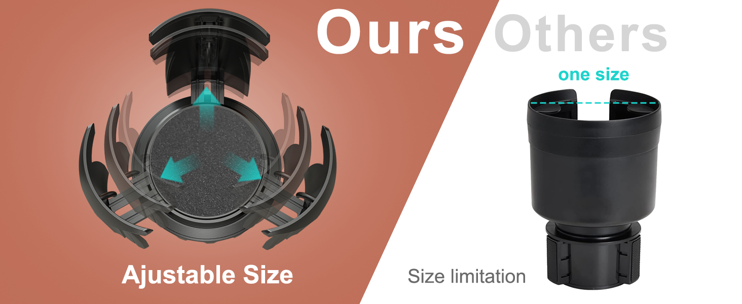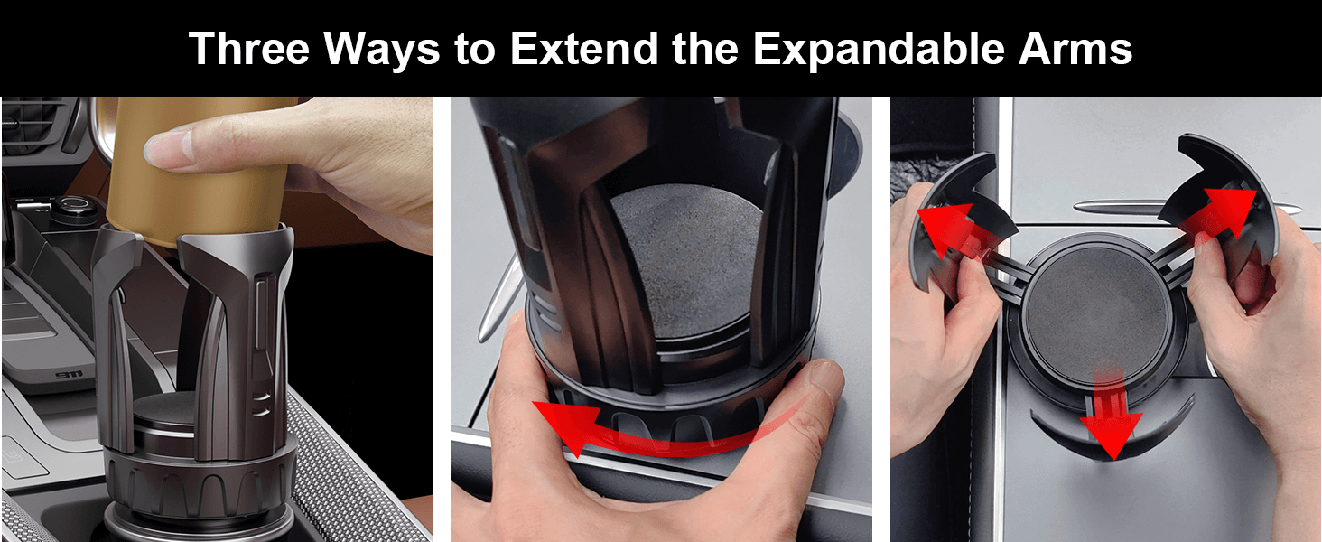 Auto-expandable Cup Holder for Car: You can drop your bottle directly at an inclined angle to squeeze the bottle into the arms. The arms will automatically expand to the appropriate cup size position.