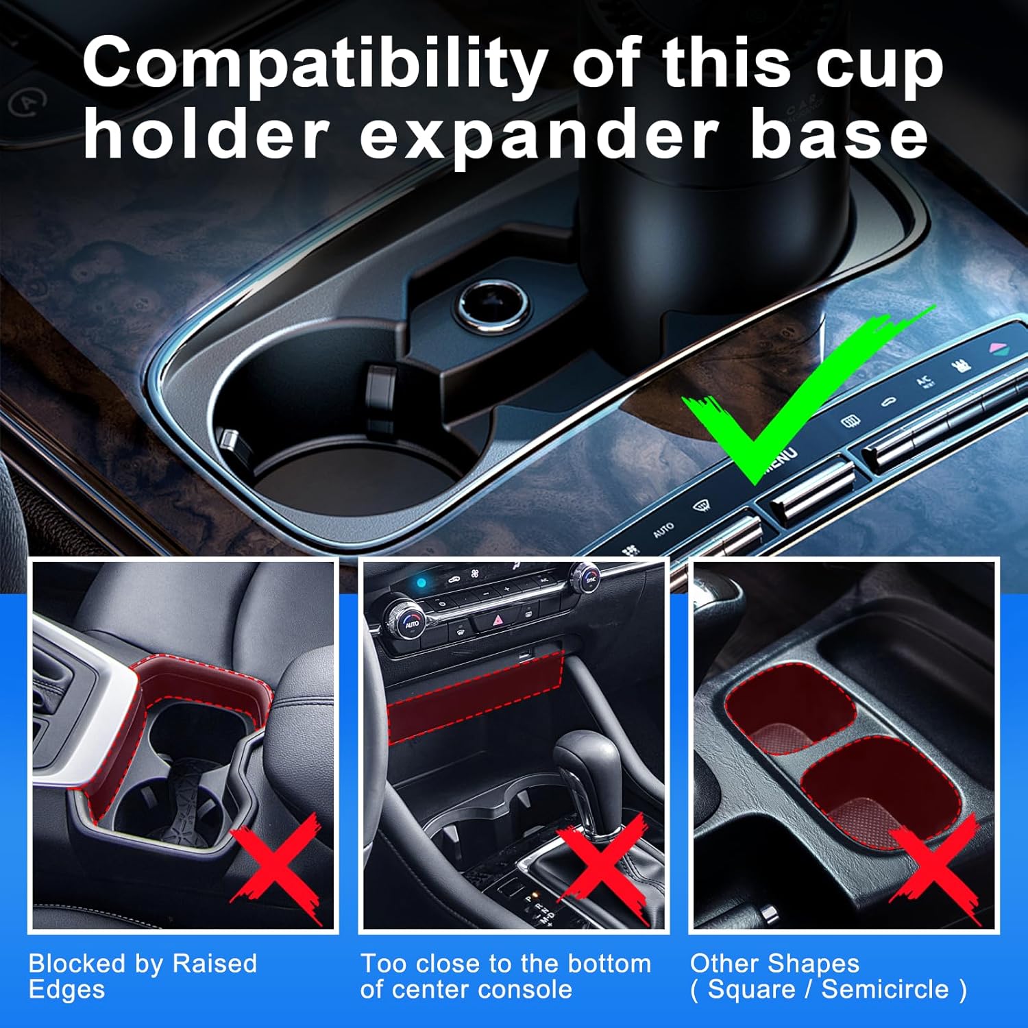 Easy Installation Cup Holder Expander for Car: Installing our Auto-Lock Cup Holder Extender Adapter is a breeze. Simply grip the middle of the base and twist to expand and detach the bottom adapter. Insert it into your car's cup holder hole and rotate vigorously for a secure fit. With its user-friendly design, you'll have this coffee cup holder installed in no time, ready to securely hold your drinks during your journeys.